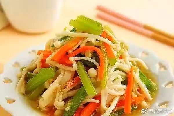 材料:金針菇,胡蘿蔔,芹菜,醋,生抽,辣椒油,香油,鹽