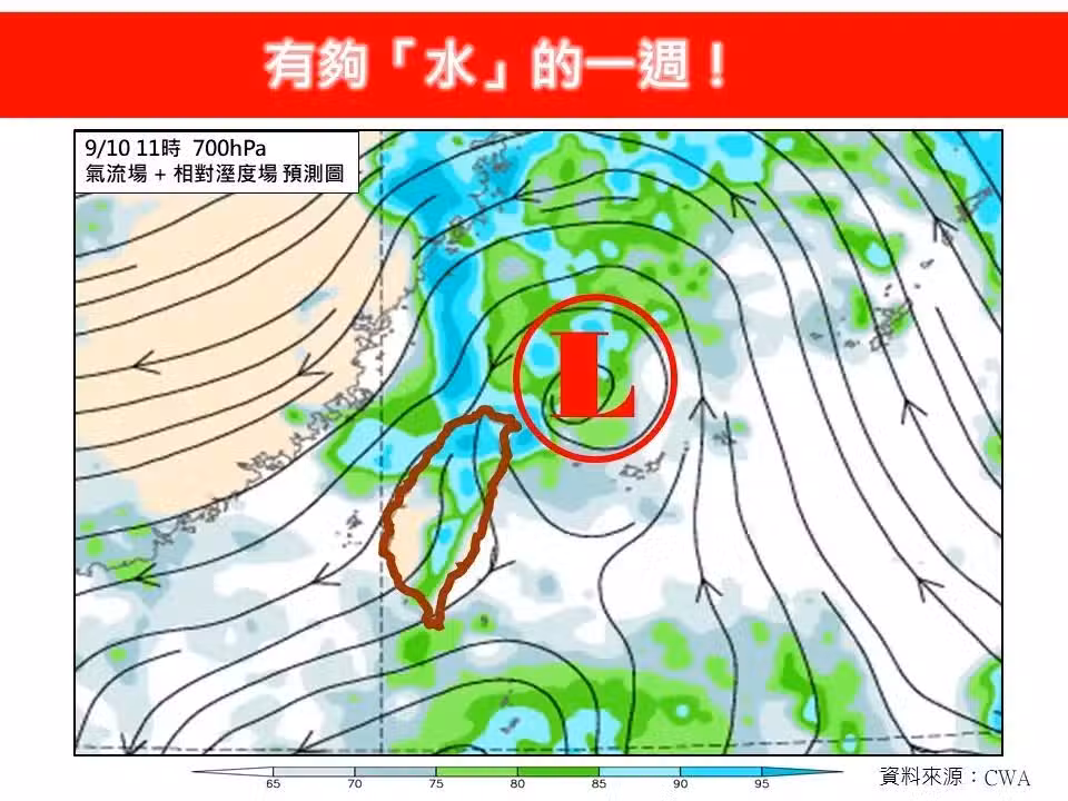 而氣象專家吳德榮也說明,最新預測顯示,明天到周三(9/9~9/11)低氣壓會通過,各地可能會有局部短暫陣雨。中南部主要是午後雷陣雨,北部和東北部則有較大雨勢,氣溫會稍微下降。周四和周五(12、13日)台灣附近水汽多,天氣不穩定,下午容易有強對流,其他時間也可能有局部短暫降雨,等於整周全台都有雨彈來襲,大家出門一定要記得攜帶雨具。