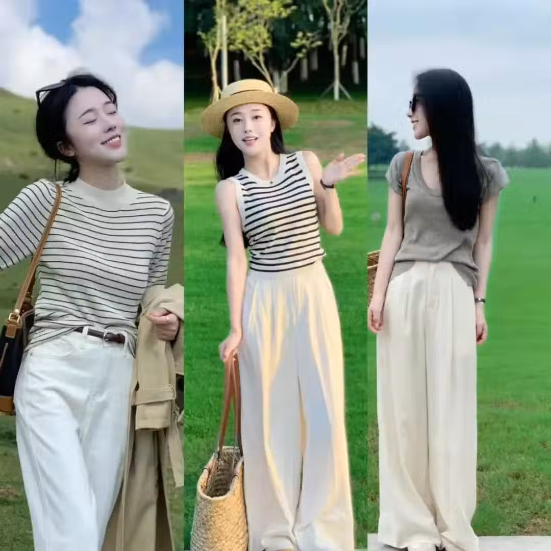 不用選擇太過於複雜的服裝進行結合,一條白色闊腿長褲,運用純色短T恤進行搭配,而在色彩方面,大家可以進行變化,讓造型有一些突破。