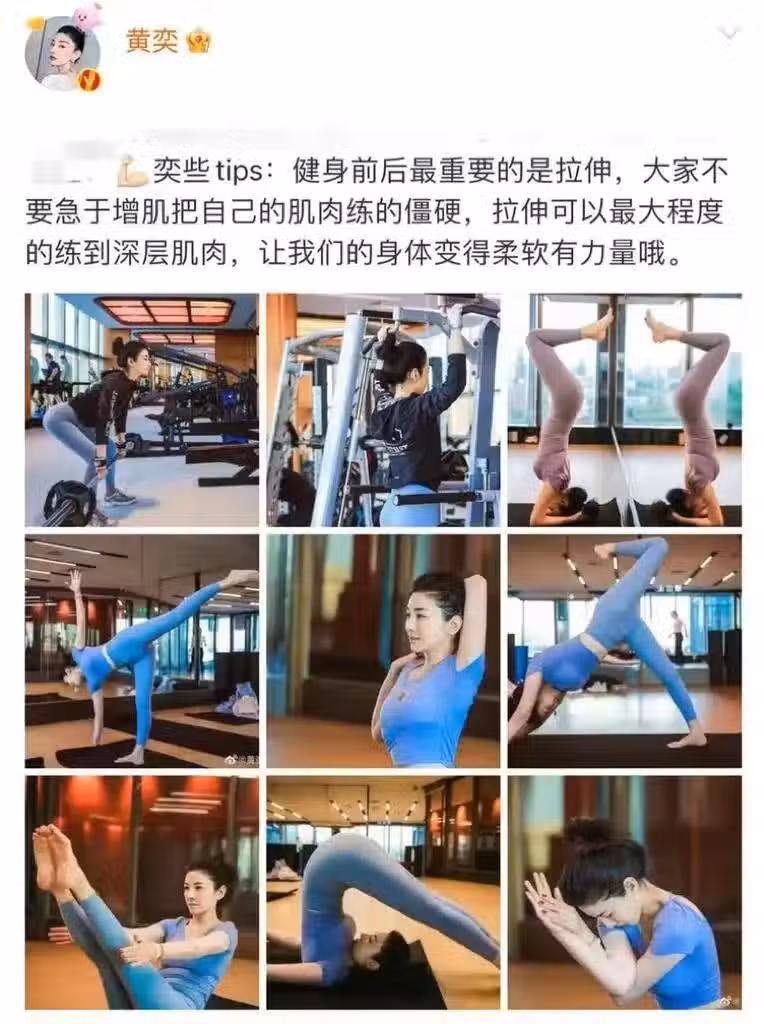 近日,女星黃奕在個人社交平台上曬出健身照並分享健身tips。