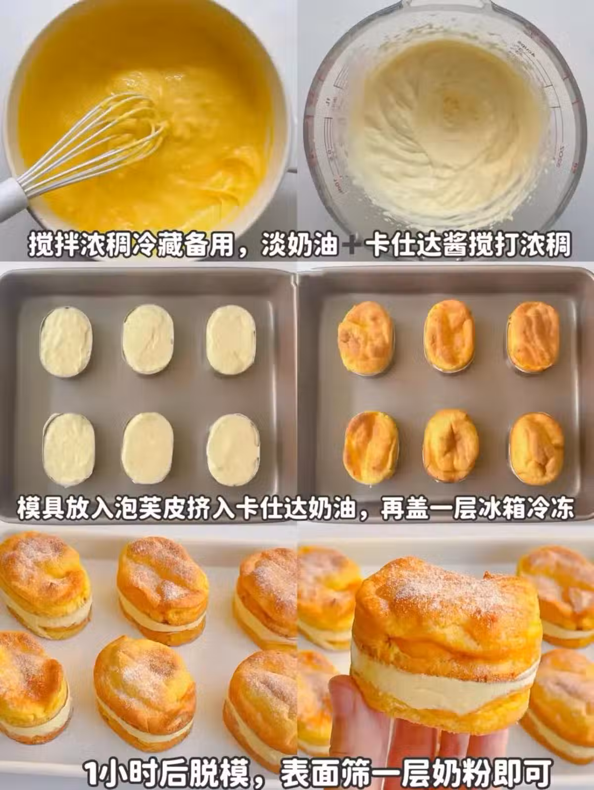當你一口咬下去,先是感受到泡芙皮的酥脆,接著是卡仕達奶油的細膩和冰涼,仿佛在吃一款高級的冰淇淋蛋糕。無論是作為下午茶的甜點,還是與家人朋友分享的美味,它都絕對能驚艷全場!