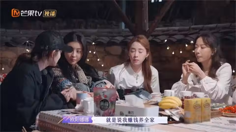 歐陽娜娜在踏入中國演藝圈後,曾有謠言指出她在短短半年內就賺了3億元,全家收入都由她1人獨扛,她也在節目中表示,外界時不時就會有「我賺錢養全家」的謠言,但其實這根本不是事實,而姐姐妮妮則在一旁假裝抹淚,開玩笑向其他嘉賓表示「你知道嗎?我每天晚上都要給她(娜娜)磕頭」,娜娜也搞笑回「等會兒你們關攝影機以後,就馬上磕一個」,有趣互動立刻逗樂全場。