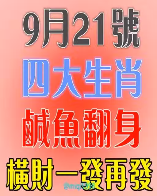 在這個金秋九月,當落葉輕舞,涼風送爽之時,宇宙的財富磁場正悄然發生偏轉,為四位幸運生肖帶來一場意想不到的財富盛宴。9月21日,這不僅僅是一個普通的日期,它是命運之輪重新洗牌,讓四位生肖朋友徹底告別苦哈哈的日子,邁向揮金如土新生活的轉折點。準備好了嗎?讓我們揭曉這四大幸運兒,看看誰將在這場財富風暴中笑到最後!