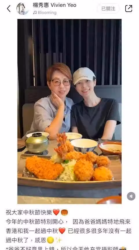 楊秀惠發文透露:「祝大家中秋節快樂,今年的中秋節特別開心,因為爸爸媽媽特地飛來香港和我一起過中秋,已經很多很多年沒有一起過中秋了,感恩」。