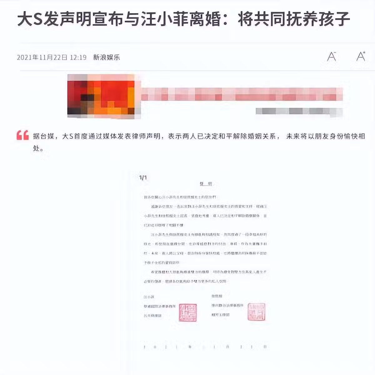 原文刊載於《大S發生命宣布與汪小菲離婚:將共同撫養孩子》——新浪娛樂——2021年11月22日