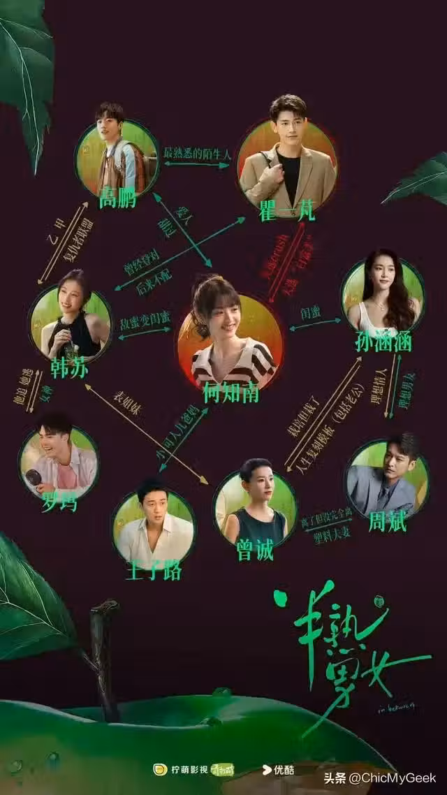 《半熟男女》的角色關係可說是歷代級的複雜,光是主角何知南(田曦薇飾)、瞿一芃(辛雲來飾)、韓蘇(周雨彤飾)、高鵬(張哲華飾)四人中,就有三對情侶,更是上演換乘戀愛!