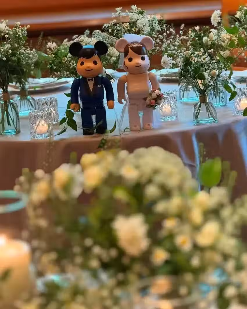 據了解,婚禮的布置風格以簡約奢華為主,白色和粉色為主色調,搭配上淡雅的花藝設計,令現場每一個角落都充滿溫馨和浪漫。