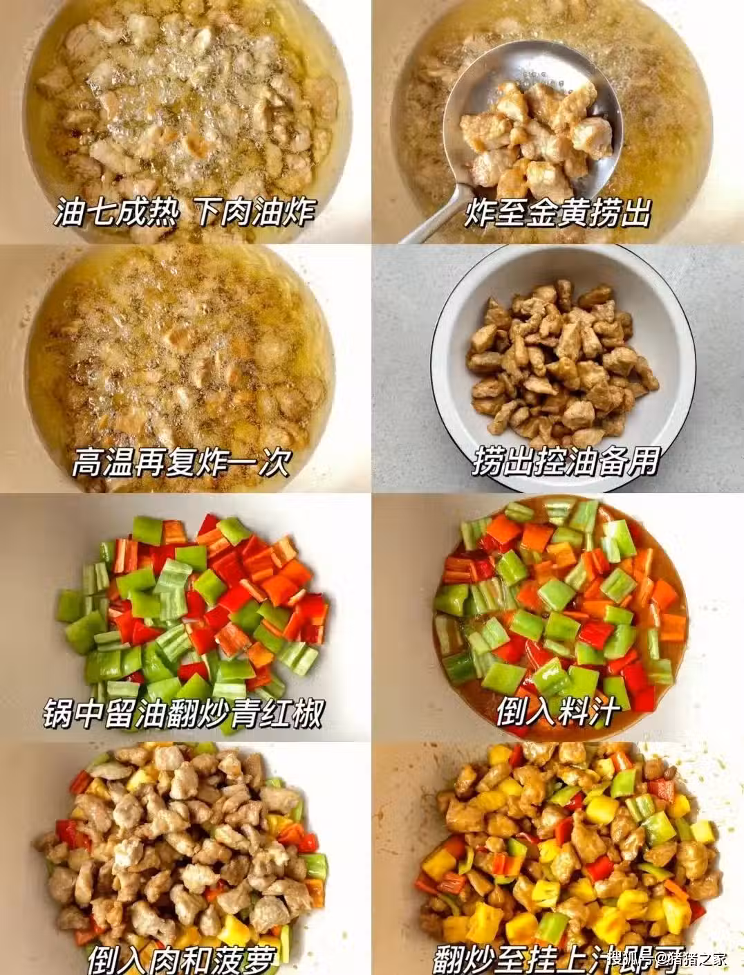 鍋里留底油,青紅椒歡快起舞,隨後倒入那碗精心調製的料汁,瞬間香氣四溢。此時,菠蘿和肉塊攜手登場,大火快炒,每一塊都均勻裹上那層誘人的酸甜醬汁。出鍋那一刻,色彩斑斕,香氣撲鼻,簡直是視覺與味覺的雙重盛宴!
