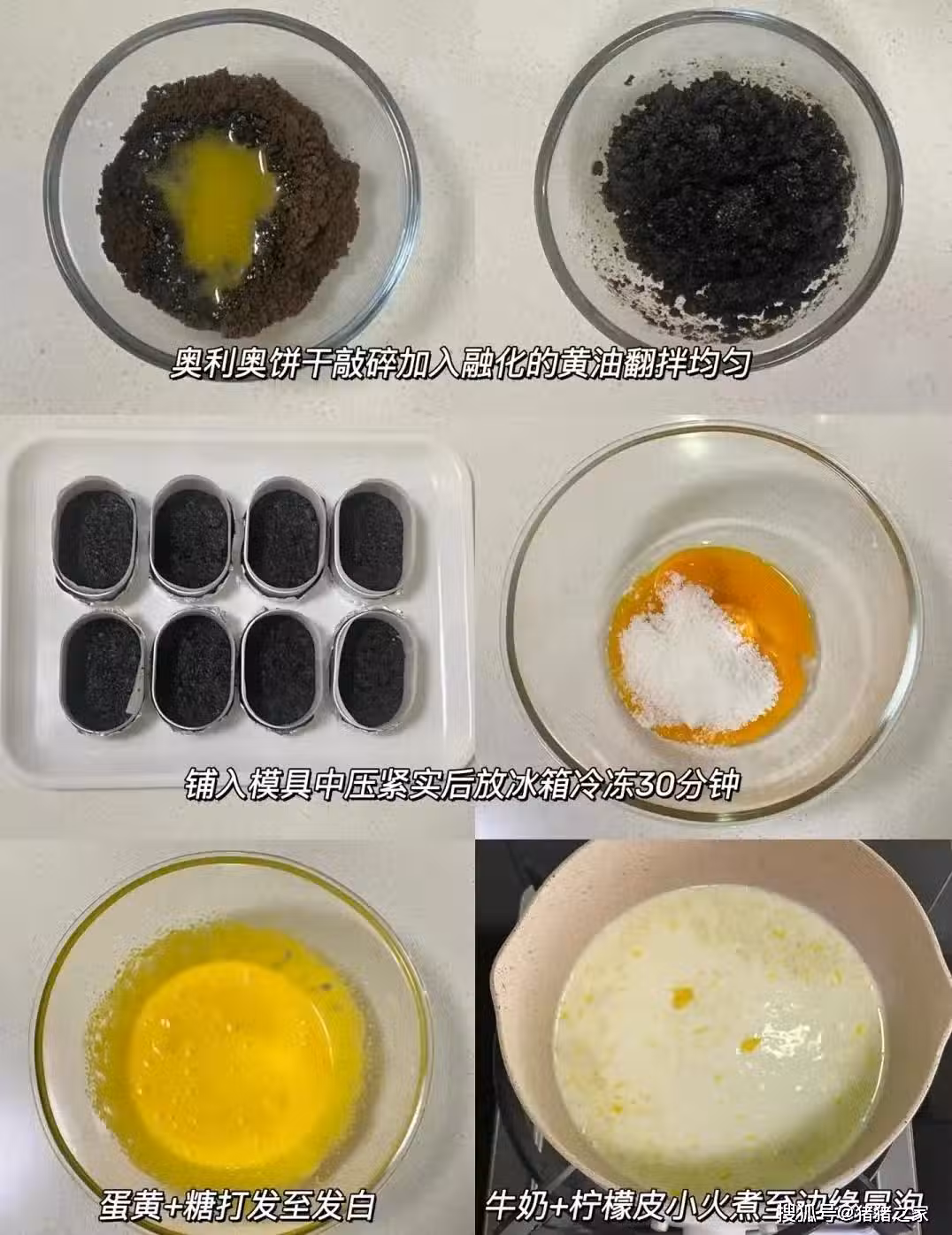 3.蛋黃加糖,瘋狂打發至體積膨脹,顏色發白,像極了雲朵的觸感。接著,緩緩倒入檸檬牛奶,邊倒邊攪。