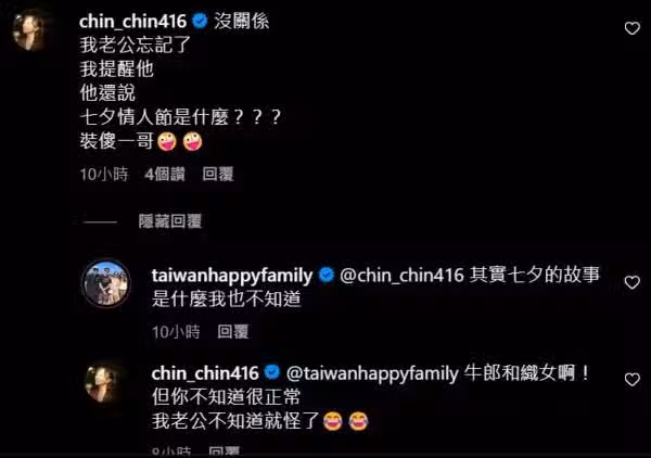 完全忘記了!」原來,他們一家人都在美國,結果老婆也忘記了,「所以我們是平等的,我還是愛你。」好友季芹也忍不住留言吐槽,老公王仁甫也忘記七夕,被提醒後還反問:「七夕情人節是什麼?」讓他哭笑不得說,另一半根本是裝傻一哥。