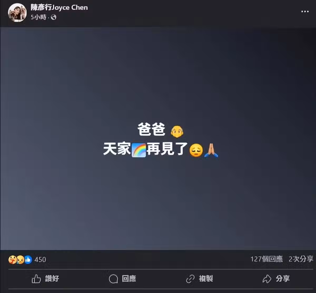 陳彥行今日發文:「爸爸,天家再見了。」透露父親已經離世,不少網民都留言悼念,並願陳彥行亡父一路好走,更有網民關心陳彥行的情緒,並留言指:「頂住呀,女兒要你照顧!」望陳彥行節哀順變。