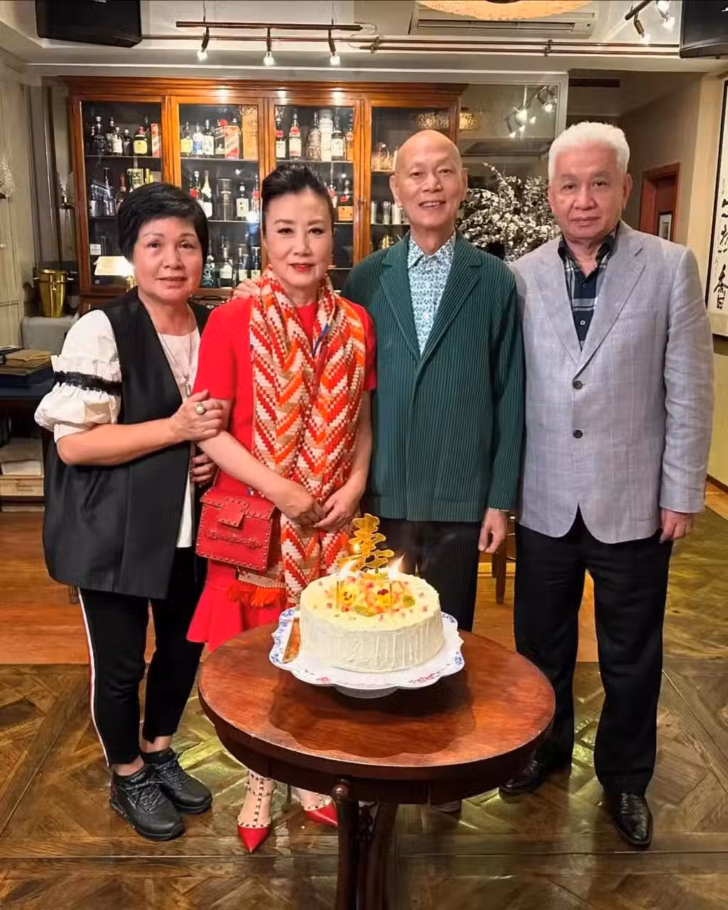 汪明荃慶祝羅家英78歲生日!全身紅打扮喜慶,穿鉚釘高跟鞋潮爆了