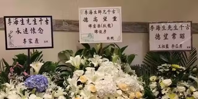 李海生喪禮現場,一切從簡。只是用白色的花朵進行了裝飾,大堂中央放著李海生的遺照。