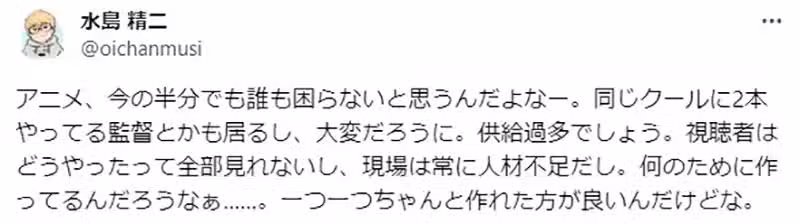 《動畫導演水島精二》坦言新番動畫真的太多了 建議砍半即便自己失業也無妨
