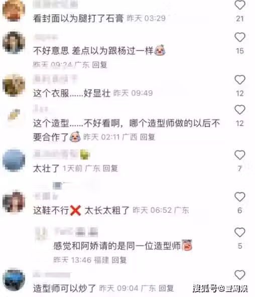 網友紛紛評論:「以為腿打了石膏。不好意思,差點以為跟楊過一樣。這個衣服,好顯壯。這個造型,不好看啊,哪個造型師做的,以後不要合作了。太壯了。這鞋不行,太長太粗了。感覺和阿嬌請的是同一位造型師。造型師可以炒了」