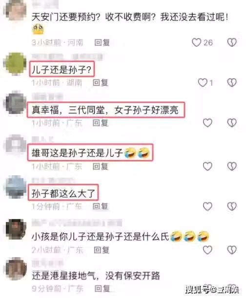 有的網友都感到非常好奇,尤其是他的兒子看起來有點小,有的網友還誤認為是他的孫子。網友評論:「天安門還要預約?收不收費?我還沒去看過呢。兒子還是孫子?真幸福,三代同堂,女子孫子好漂亮。雄哥這是孫子還是兒子?孫子都這麼大了?小孩是你兒子還是孫子還是什么姓氏?還是港星接地氣,沒有保安開路」