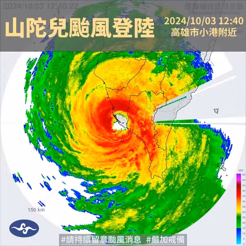 中度颱風山陀兒今天中午12時40分登陸高雄市小港區。中央氣象署表示,颱風暴風圈已進入台中以南、南投、花東陸地及澎湖,對桃園以南、南投、宜蘭、花蓮、台東地區及澎湖構成威脅,預計此颱風強度有持續減弱的趨勢。