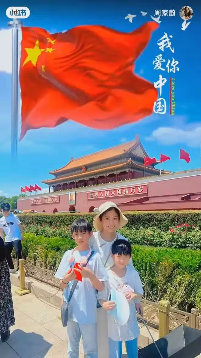 她不時都會在社交平台表愛國心,前段時間更帶兩個兒子到首都北京參觀,還順便可以探班北上工作的老公。