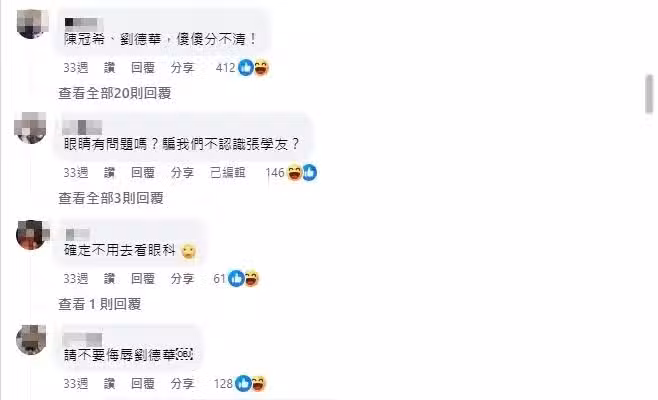 對此,許多網友也紛紛熱議:「華仔被黑得最慘的一次」、「劉德華看了估計要氣暈了!」、「請不要侮辱劉德華」、「攪到劉德華情可以堪」、「怎麼看起來像陳冠希呀」、「我叫陳冠希跟我念一遍」、「這都可以有4萬幾人贊!」、「故意的,要蹭流言的量的,別被騙了」、「眼盲,可能連老公都認錯」、「眼睛有問題了」、「陳冠希、劉德華,傻傻分不清!」此外,也有網友笑虧:「瞎說明明就是成龍」「這明明是敖犬」、「張學友啦X,搞不楚清喔」、「這是周星馳吧! 故意引發話題」。