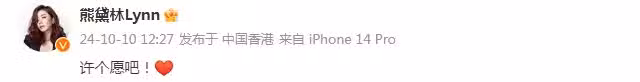 10月10日下午,女星熊黛林在社交網更新兩張近照,簡短配文稱「那就許個願吧」,並Tag上愛心emoji表情符號,美好心情,溢於言表!