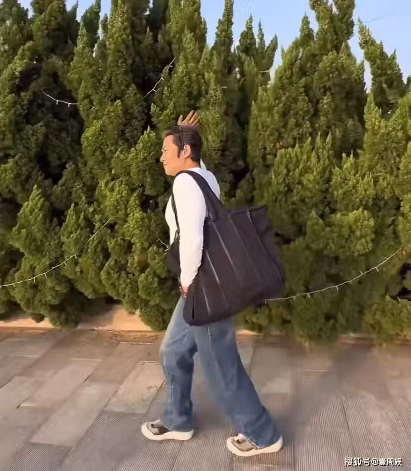 唐文龍頭上戴著墨鏡,依稀可見前額的髮根有些白了,但絲毫不影響他帥氣的面孔,他的身上還挎著一個超大的帆布包,穿梭在林間小路,心情看起來非常的不錯,狀態也是滿滿,完全不像54歲的人,尤其是身材保持得相當不錯。