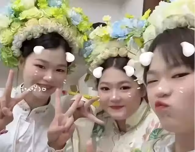 這次出行,全家三姐妹也是罕見同框亮相,姐姐全紅月站在鏡頭的左邊,戴著草藍色的簪花,穿著和妹妹一樣的復古衣服,笑容滿面,露出了一口潔白的牙齒,雙手同樣擺出勝利的手勢,看起來既自信又開心。全紅嬋則站在鏡頭右邊,嘟著小嘴,雙手做著同樣的手勢,眼睛眯成了一條縫,看起來十分搞笑。妹妹全紅桃站在中間,臉上洋溢著幸福的笑容,粉絲都一致認為,妹妹全紅桃的顏值可真是搶了全紅嬋風頭。