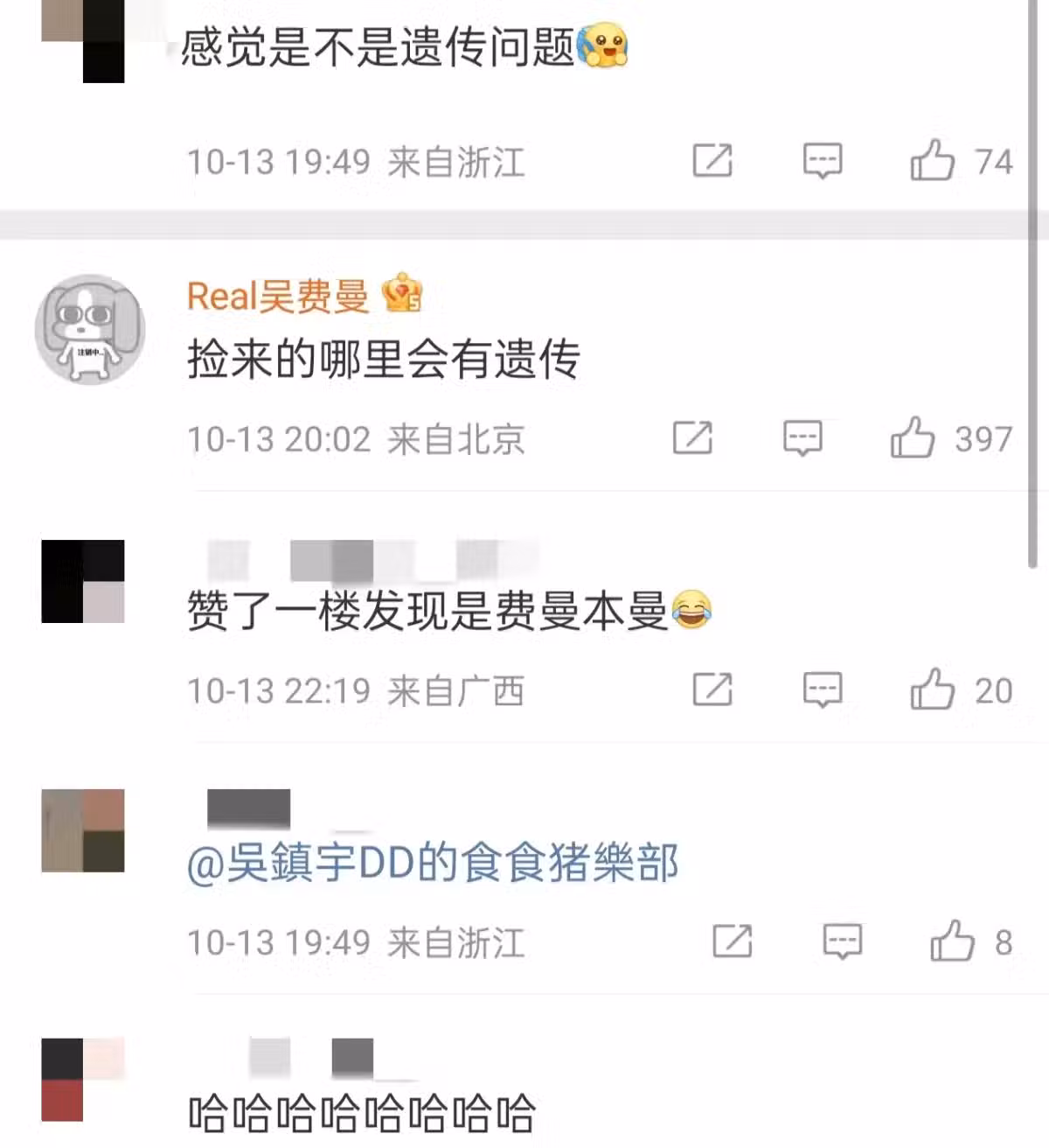 費曼更是現身爸爸吳鎮宇評論區回復網友:「撿來的,哪裡會有遺傳。」