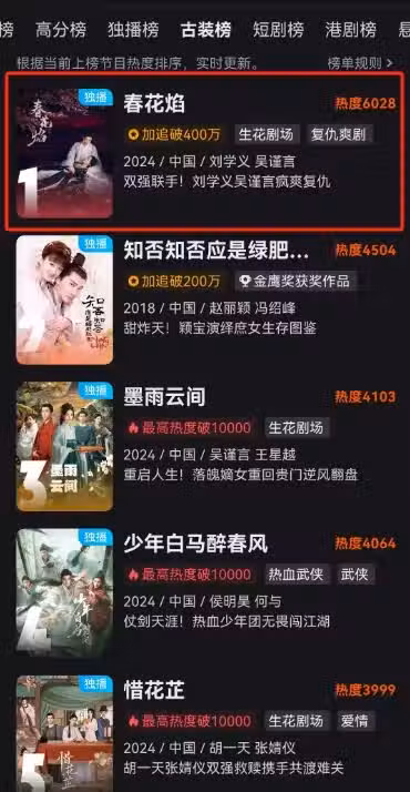 別看是在中午檔低調登場,該劇一經亮相,直接斬獲熱度榜榜首。 看來,繼《邊水往事》《雪迷宮》後,褲家又開始發力了。 我敢說,這麼一部《春花焰》,絕對有望挽救低迷的古偶市場!