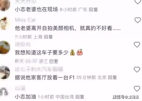 網友紛紛留言:「小志老婆也在現場。他老婆離開自拍美顏相機,就真的不好看。我想知道這車子要多少錢?據說他家客廳放著一台F1。小志加油!」