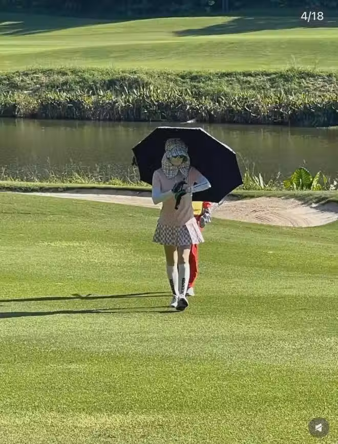 只見她穿著粉紅色小短裙,眨眼一看還以為是位少女,而且防曬功夫做得十足,全身上下包得嚴嚴實實還要撐傘,所以她皮膚好不無道理。