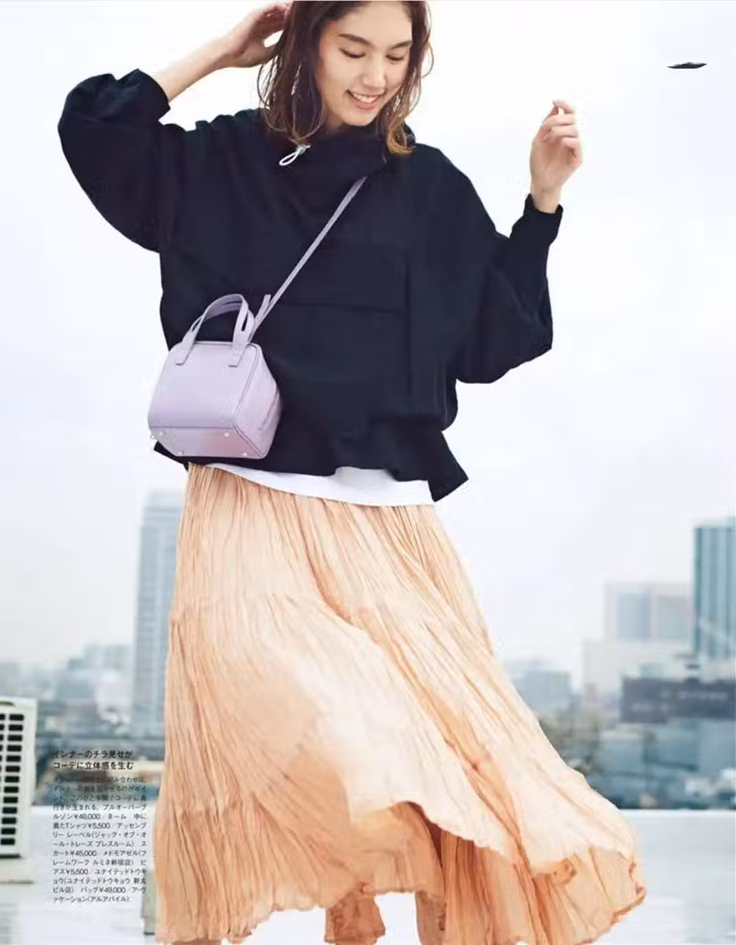 女性出門時,大多都有佩戴包包的習慣,那就可以藉助包包去強調腰線的位置,像上圖這樣:黑色的寬鬆衛衣外面斜挎著一款香芋紫的方形包包,剛好坐落在一側的腰部,再加上比較搶眼的配色,瞬間就成功將觀賞者的視線聚攏起來,做到了不動聲色的顯高顯腿長。