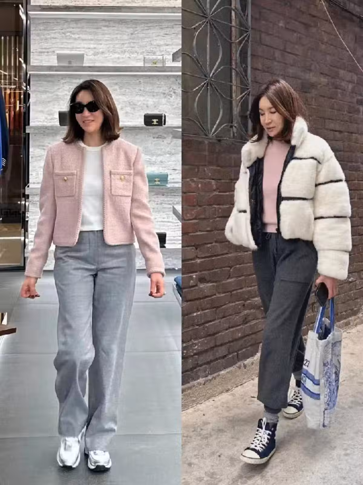 像這位韓國博主往往會選擇採用直線剪裁的長褲,修飾腿部線條,同時按照上短下長進行搭配,顯得身高腿長。