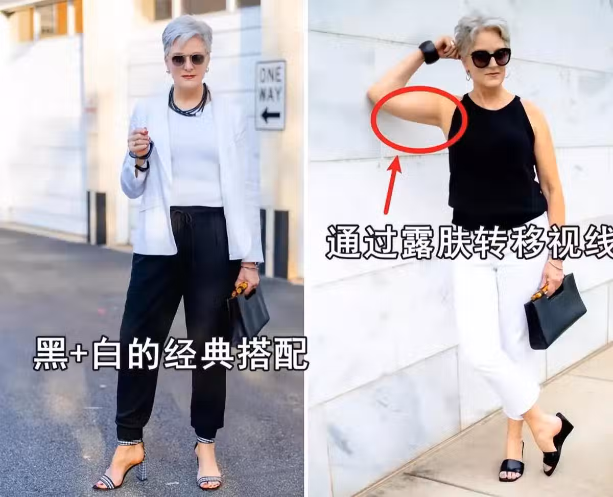 顏色搭配也是顯瘦的很重要的方法,我們都知道黑色有收縮顯瘦的效果,而白色能讓整體更加輕盈,那麼我們就可以利用黑+白的搭配來顯瘦。比如說 選擇上修身的黑+下寬鬆的白,或上寬鬆的白+下修身的黑,又或者上有設計感的黑+下基礎款的白,以此來展現著裝的時髦感。