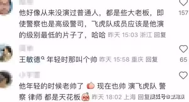 網友紛紛留言:「他好像從來沒演過普通人,都是些大老闆,警察也是高級警司,飛虎隊成員應該是他演的級別最低的片子了。王敏德年輕時那叫個帥。他年輕的時候老帥了。現在也帥,演飛虎隊、警察、律師、都是天花板。」足以看出,演員顏值的重要性啊。