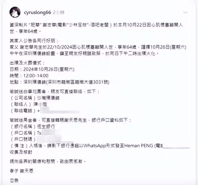 謝志華兒子謝天恩透過友人,今日於社交平台轉發訃聞,公布喪禮詳情,訂於10月26日12時在深圳殯儀館設靈,並於同日下午2時出殯火化。此外,花圈另有查詢熱線安排,帛金可直接轉帳謝志華兒子謝天恩戶口。最後,謝志華兒子謝天恩感激各界的關懷和慰問。