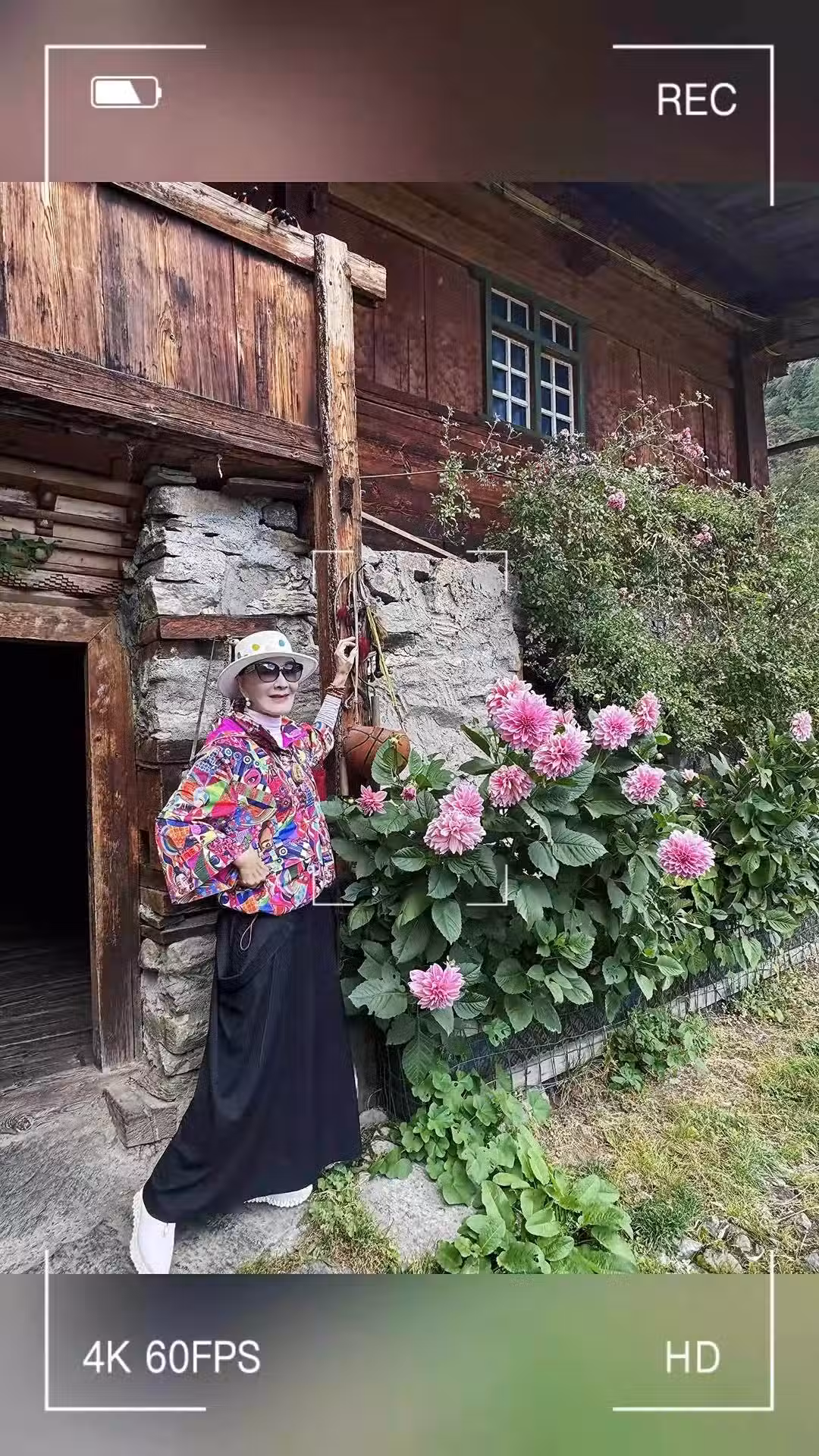 這組照片中,夏台鳳穿著一件顏色鮮艷的印花上衣,搭配寬鬆的黑色長裙和舒適的白色鞋子,顯得既時尚又樸素。她頭戴一頂時尚的白色草帽,帽檐上點綴著幾朵小花,頗具田園氣息。她站在鄉村小屋前,靠在門邊,身旁是盛開的粉色大麗花,整個人看起來與自然環境完美融合,充滿了寧靜與和諧的氣息。