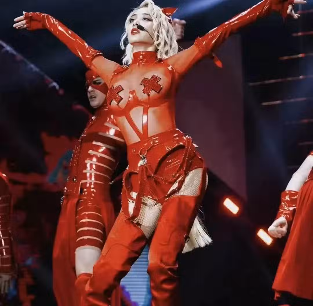 蔡依林非常適合長褲和短上衣的搭配,淺色牛仔上衣打結配黑色背心,下身紅色運動褲製造視覺重心,整個人看起來都年輕了不少。她經常給人一種氣場強大的印象,很大程度上還是因為她的颱風。如果蔡依林走王心凌的風格,估計大家就不會叫她「女王」了。舞台造型上,蔡依林一直很超前,甚至穿過很多被吐槽的奇葩衣服。早年大唱《愛情三十六計》時,她就穿著比基尼和黑色流蘇短褲,大秀好身材。