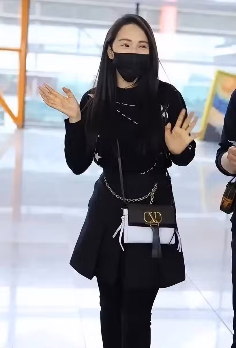 第二個亮點在於鞋子的搭配上,她的腳上搭配了一款過膝長靴,一般來講過膝長靴其實是比較難駕馭的,也比較容易顯腿短。但是,伊能靜的搭配卻沒有產生這種負面的穿搭效果,這就是同色系搭配的功勞。