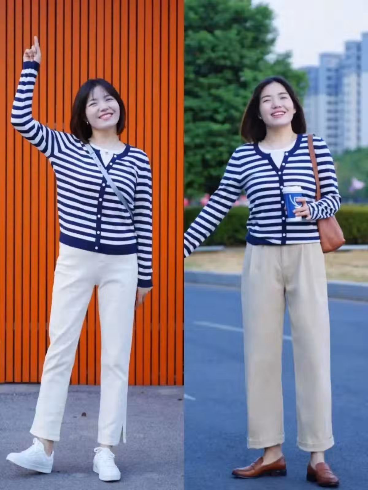 人到中年,很多人的身材逐漸走形,表現為贅肉囤積在腰腹、大腿部分,穿奶奶衫建議搭配直筒長褲,藉助硬朗材質+直筒剪裁美化腿型。