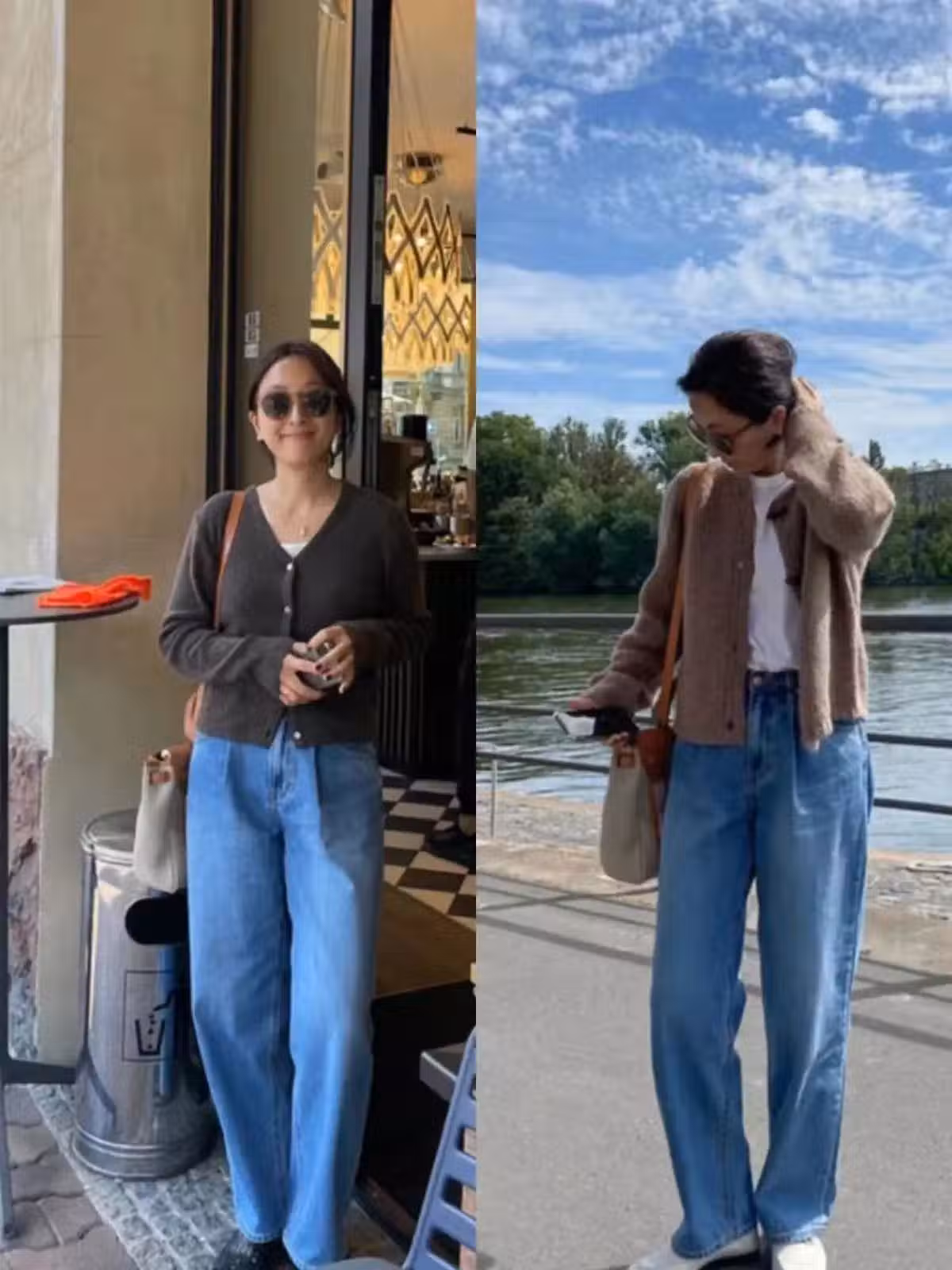 藍色牛仔褲稱得上秋季百搭神器,與純色奶奶衫的搭配簡單卻不顯悶,很適合中年女人。