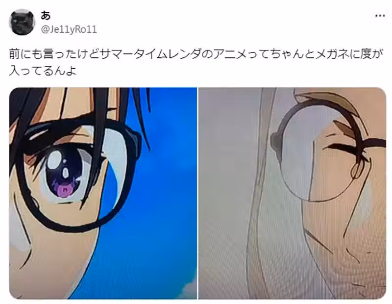 據他所說,2022年播出電視動畫的《夏日時光》當中,凡是戴眼鏡的角色,都經常會出現這種描寫。而且動畫師們又將這種光學現象描繪得相當自然,讓觀眾不仔細看都不覺得奇怪,仔細看又能察覺動畫師們的用心,可見這部作品真的特別講究眼鏡的刻畫啊!