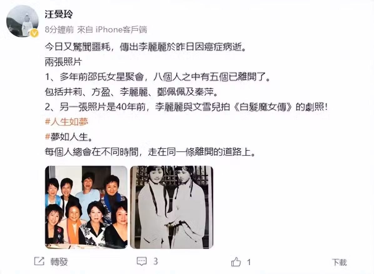 10月28日,香港媒體人汪曼玲透露武打女星李麗麗去世,享年74歲。
