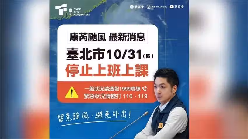 而康芮被稱為史上「10月登陸最強颱風」,稍早已有清理路樹的工務局人員受傷,台北市災害防救辦公室也呼籲民眾「現在起到晚上20時」是風力最強時段,非必要請勿外出!