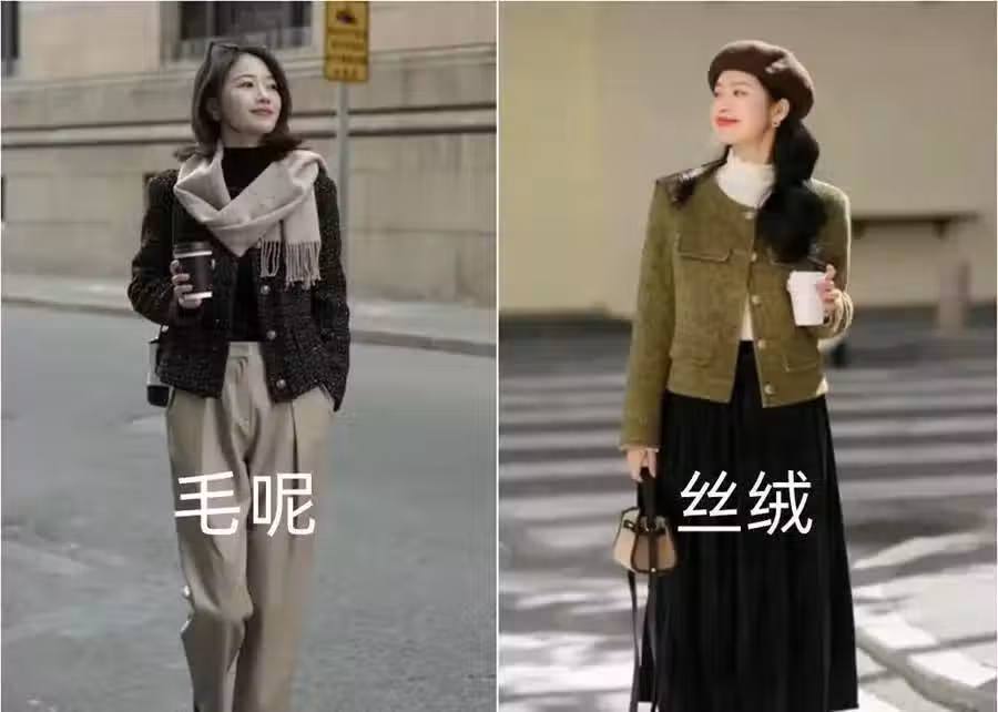 本身是復古的風格,搭配的下裝如果材質類似,可以將古典的氣息詮釋的更到位,氣質也會提升。選擇粗毛呢、絲絨或者緞面等材質,都是帶著高貴氣息的,穿上身就能起到面料上的一致感。