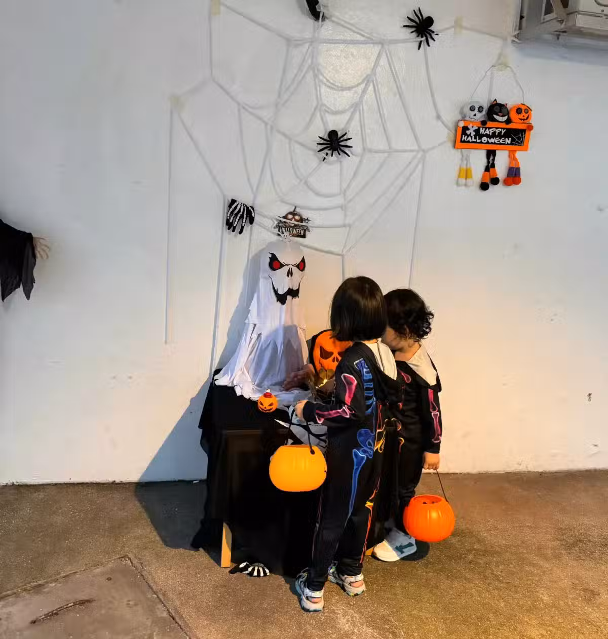 小珍珠姐弟倆一人提著一個南瓜燈去拿糖果,真的好開心。從一家人玩耍的背景可以看出,楊怡應該是特意在家附近找了個地方簡單布置了一下,讓孩子們感受一下節日氛圍。楊怡和羅仲謙陪著孩子,當不掃興的父母,真的很用心呀。