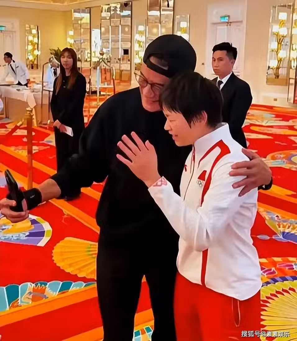 影帝拿著手機示意全紅嬋對鏡頭打招呼,全妹此時顯得比較拘束,哈哈。