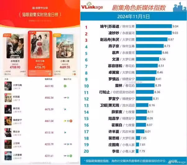 品質劇帶動劇集角色出圈。Vlinkage數據顯示,趙露思飾演的端午/蘇幕遮一角首日新媒體指數破9、位居榜首,《永夜星河》中女主凌妙妙(虞書欣 飾)則位列其後。