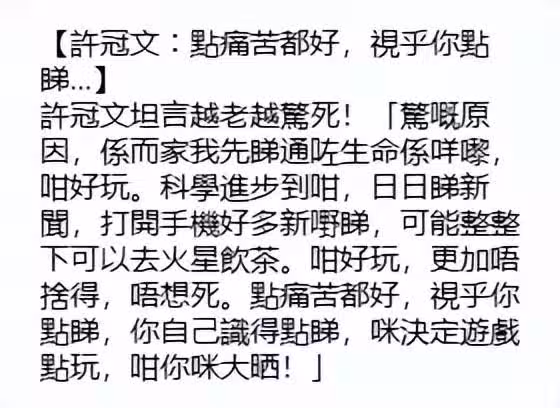 許冠文說不捨得離開這個世界,因為太好玩了,但無論怎麼痛苦都好,看自己的想法,如果自己懂得看開一點,就可以決定遊戲怎麼玩,那麼你在這個世界就「大曬」。