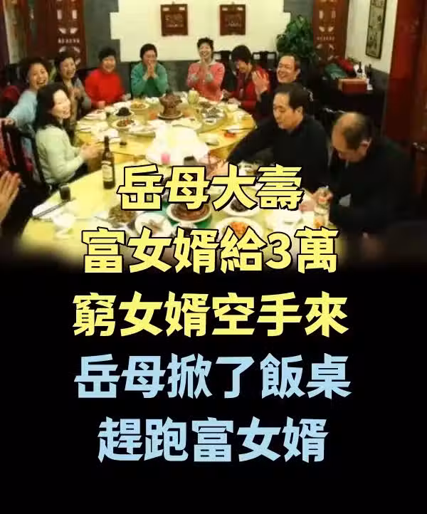岳母大壽,富女婿給3萬,窮女婿空手來,岳母掀了飯桌趕跑富女婿!