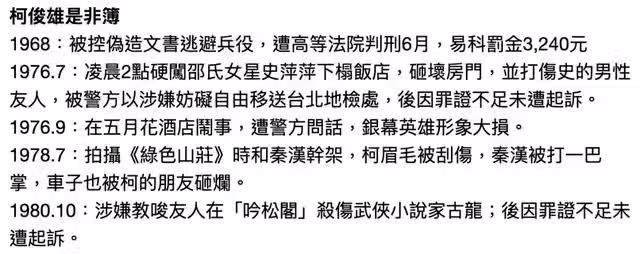 柯俊雄做的最大的惡應該是傷了古龍的手,就因為古龍不肯到他的房間給他敬酒。古龍大出血之後送到醫院急救,全身換血染上肝病。